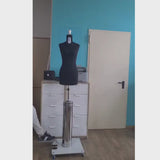 Base professionale per manichini sartoriali, dotata di pistone pneumatico regolabile in altezza tramite pedale situato alla base.
